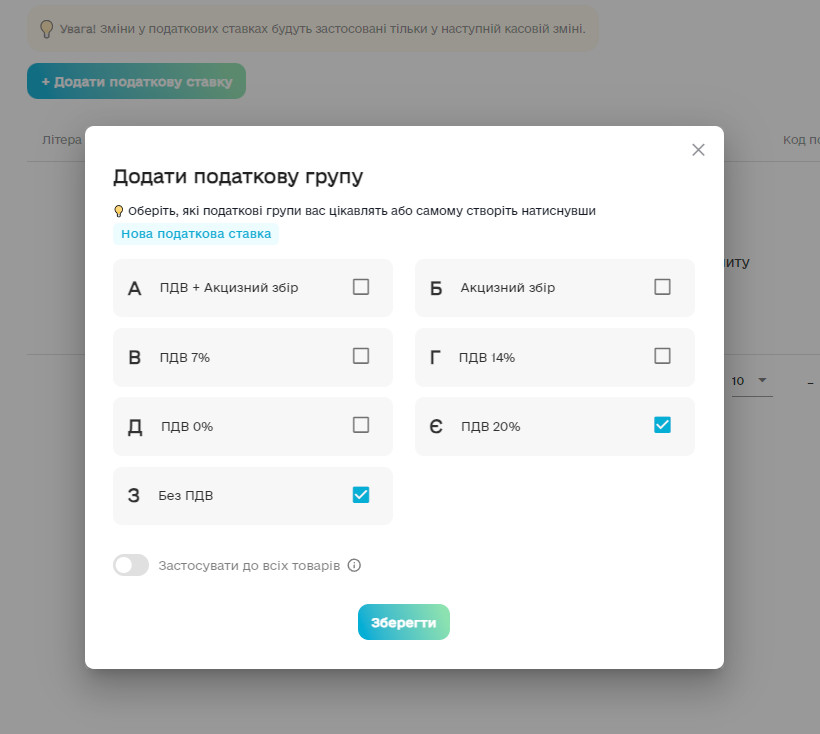 УВАГА! Для того щоб будь-які зміни в податках збереглись треба відкрити нову зміну.