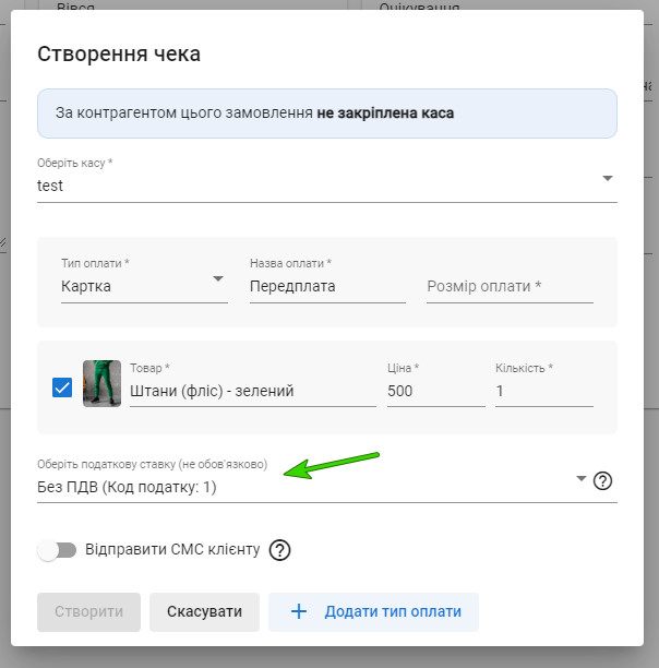 3. Тепер якщо за касою закріплений податок він буде автоматично обраний при створенні чека.