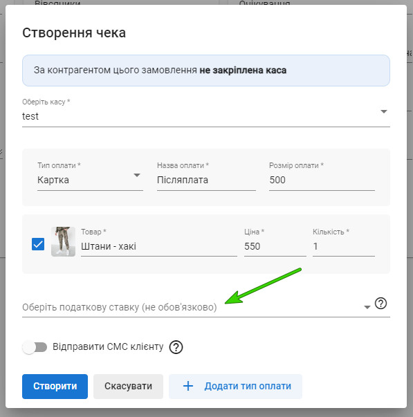Якщо Вам не треба додавати податок при створенні чека, можна залишати це поле пустим і нічого не обирати, одразу натискати "Створити"