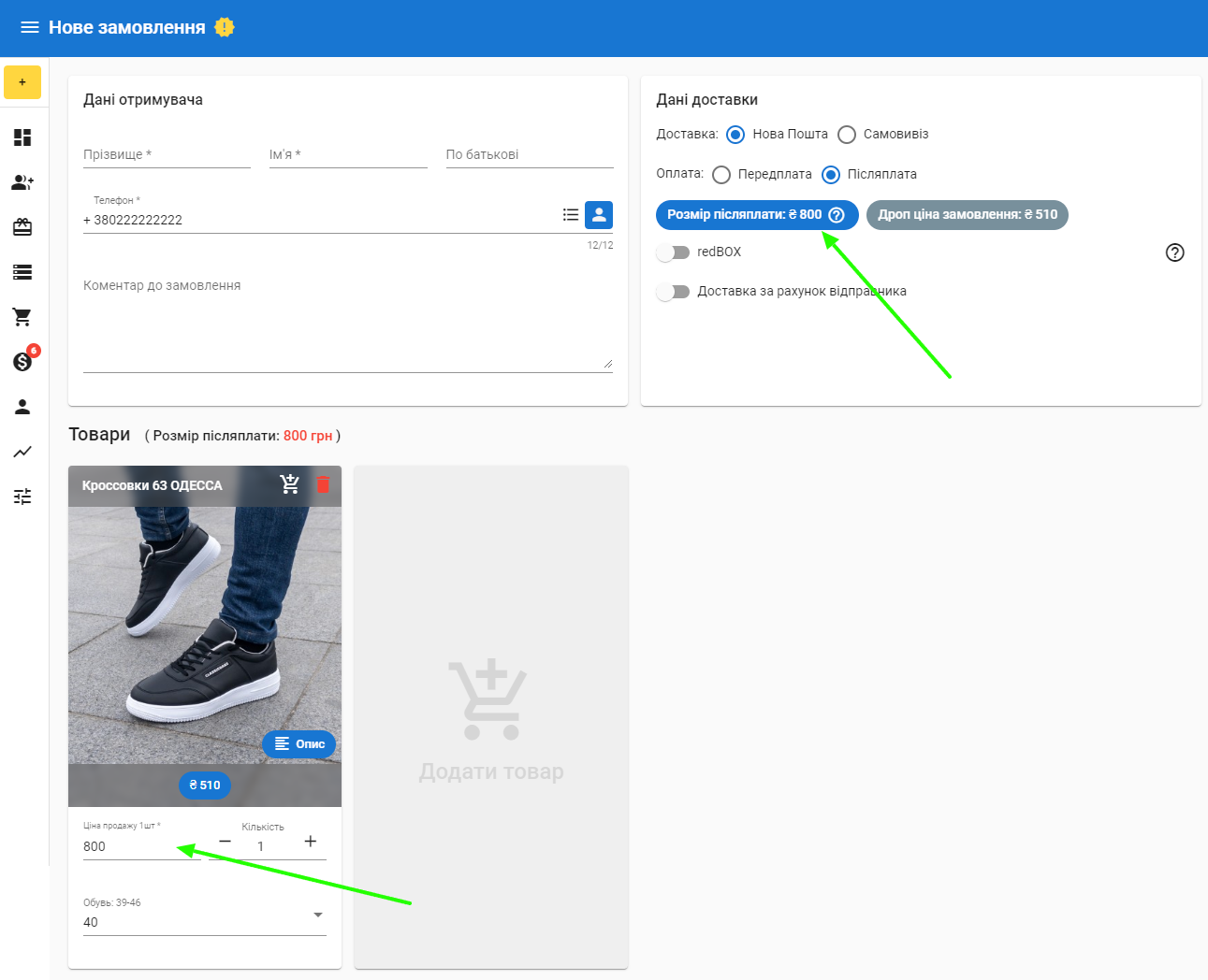 Для того щоб вказати розмівр післяплати або передплати треба додати товар та просто указати його ціну.